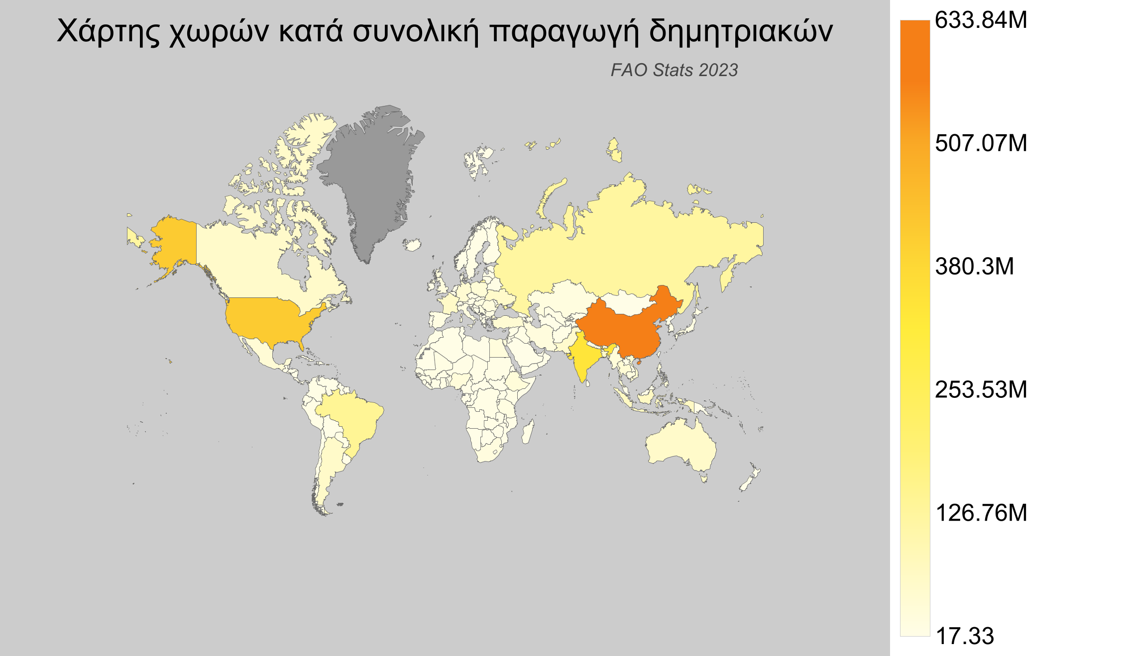 - Ελλάδα: Παραγωγή 3.4 εκατομμύρια τόνων, κατατάσσοντας τη χώρα στην 73η θέση παγκοσμίως.