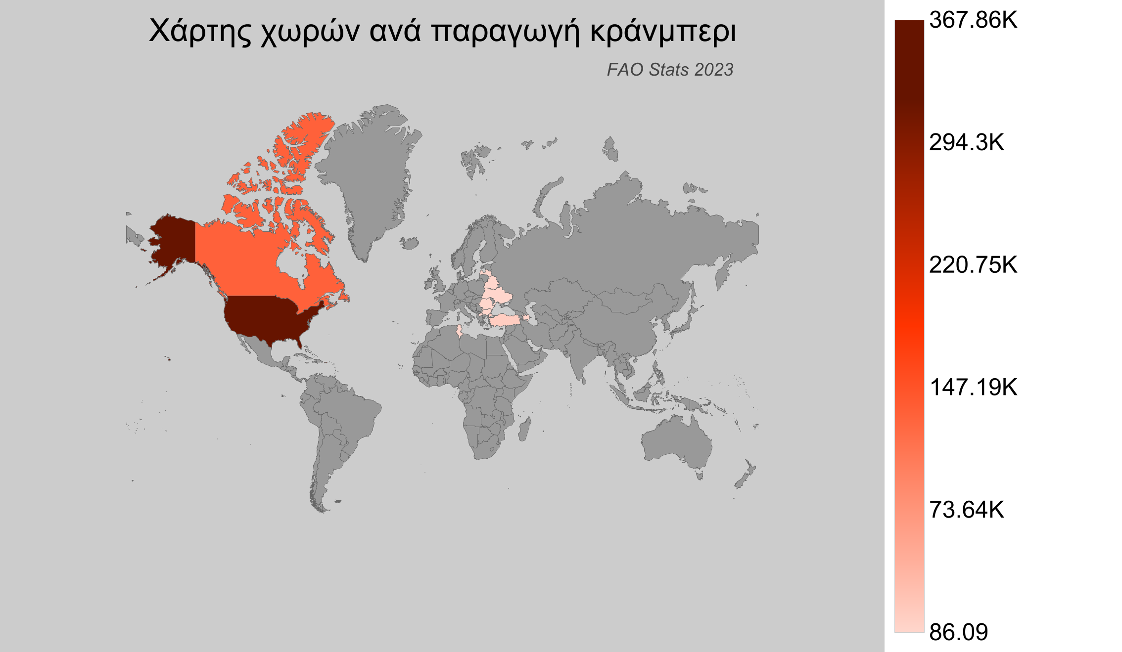 - Ελλάδα: Σύμφωνα με τα FAO στατιστικά, η Ελλάδα δεν είναι καταχωρημένη ως παραγωγός cranberry.