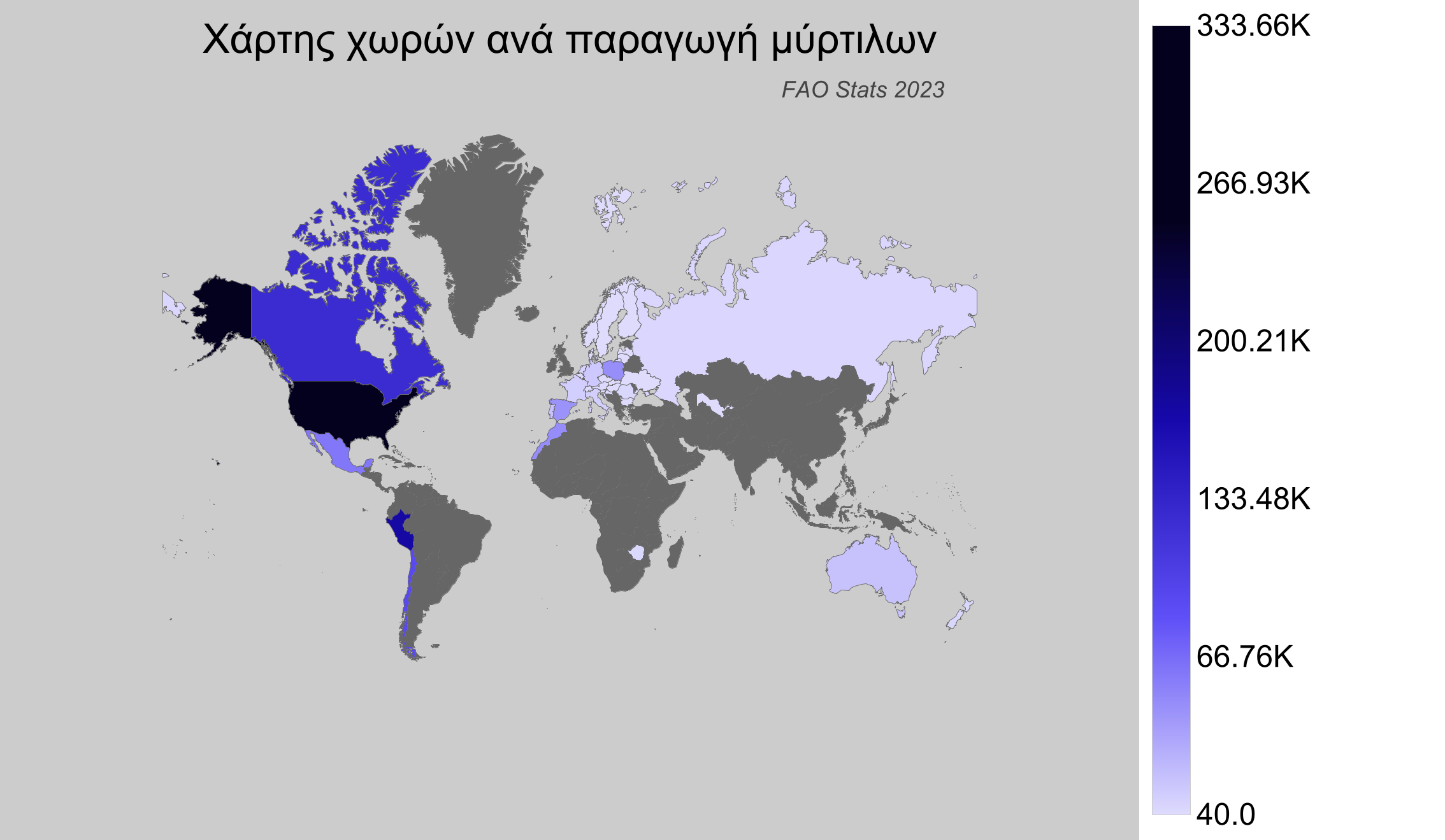 - Η Ελλάδα δεν περιλαμβάνεται στον κατάλογο των παραγωγών μύρτιλου σύμφωνα με τα δεδομένα του FAO.